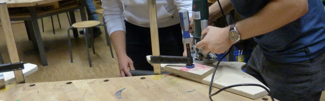 Eine gleichmäßige und starke Rundung am Haikörper gelingt uns mit einem entsprechenden Fräskopf der Oberfräse. Ein Schüler der Oberstufe führt diese Aufgabe aus.